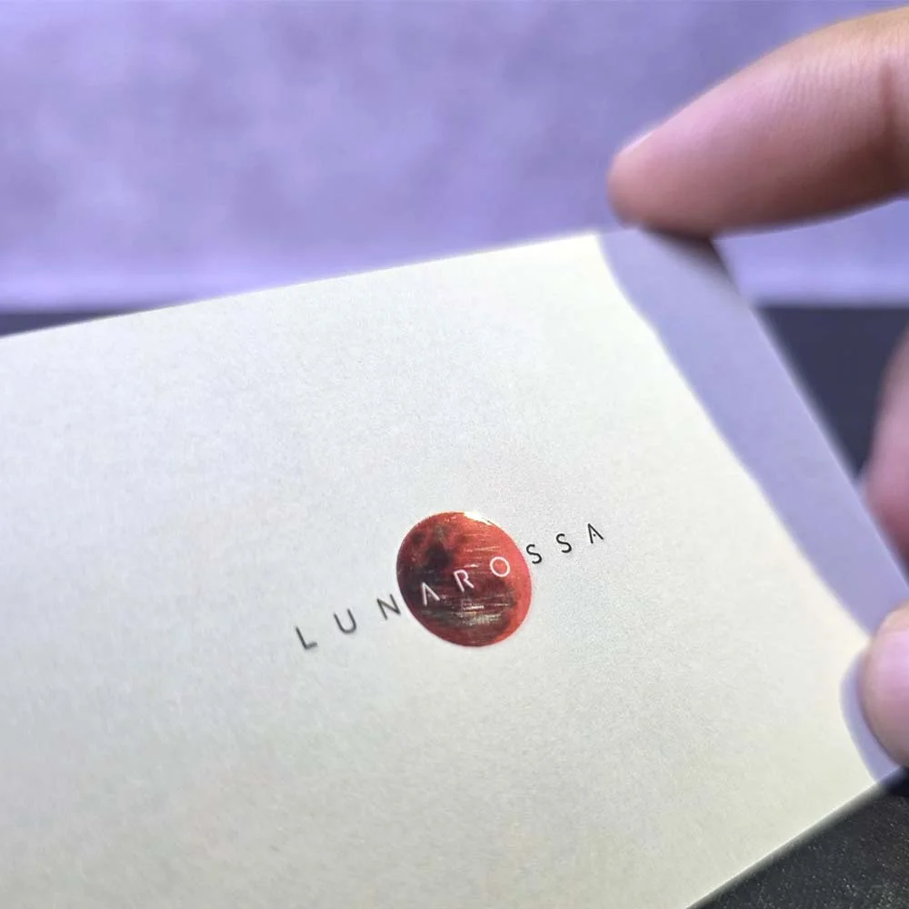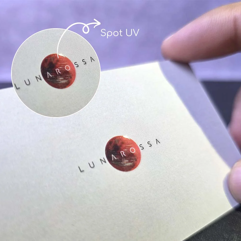 Printed on thick 350–700gsm premium stock and finished with smooth matte or velvet lamination, the raised UV coating gives you the best of both worlds: a soft-touch base with high-gloss highlights where you want attention most. It’s ideal for showcasing your logo, name, or design elements with crisp clarity and a subtle 3D effect.